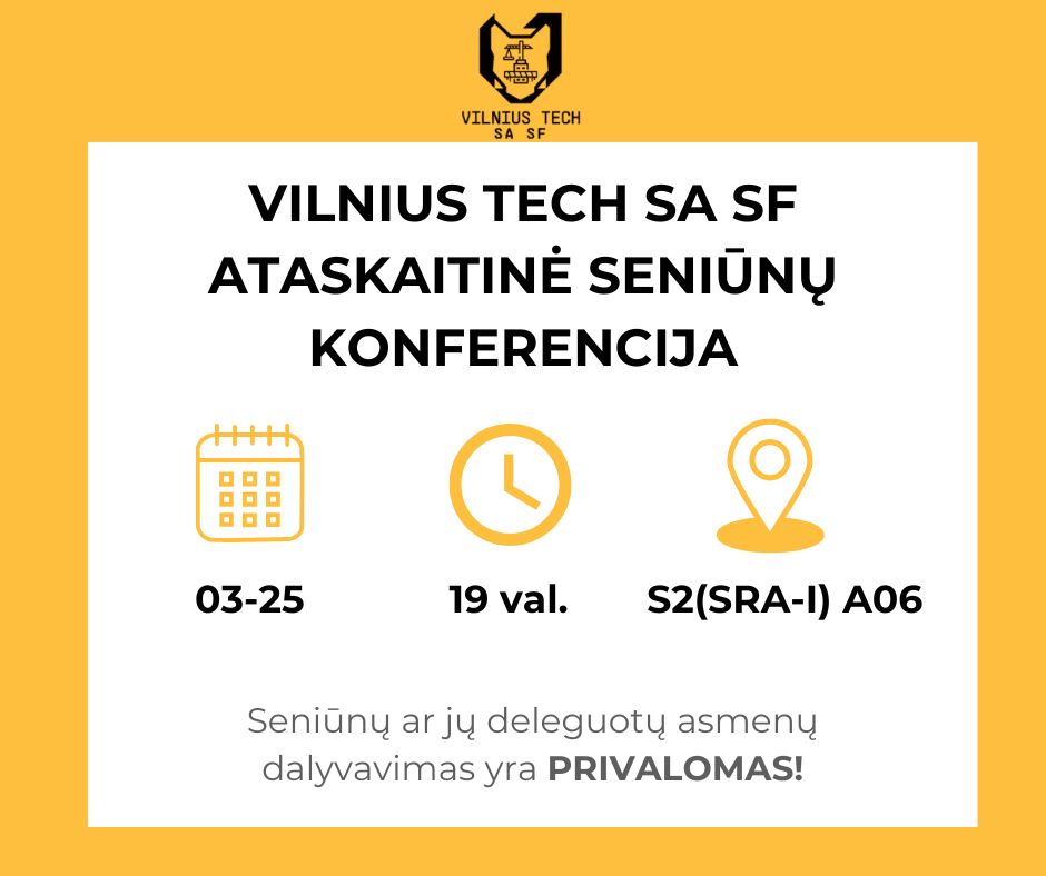 Kovo 25 dieną vyks VILNIUS TECH SA SF Ataskaitinė seniūnų konferencija, kurioje dabartinė pirmininkė Sintija Mikulskytė pristatys savo veiklos ir financinę ataskaitas, todėl visų SF seniūnų (ar jų deleguotų asmenų) dalyvavimas yra PRIVALOMAS!