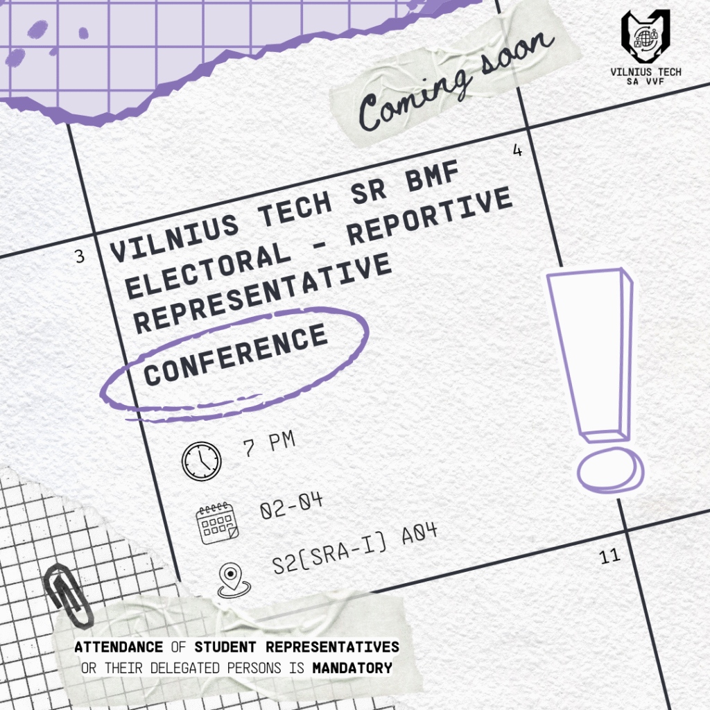 EN: On February 4th at 7:00 PM, we invite everyone to the VILNIUS TECH SR BMF reporting and election seniors’ conference, which will take place in S2 SRA-I A04. During the event, the VILNIUS TECH SR BMF chairperson, Vytautas Jasiulionis, will present his activity report. A new VILNIUS TECH SR BMF chairperson will also be elected.