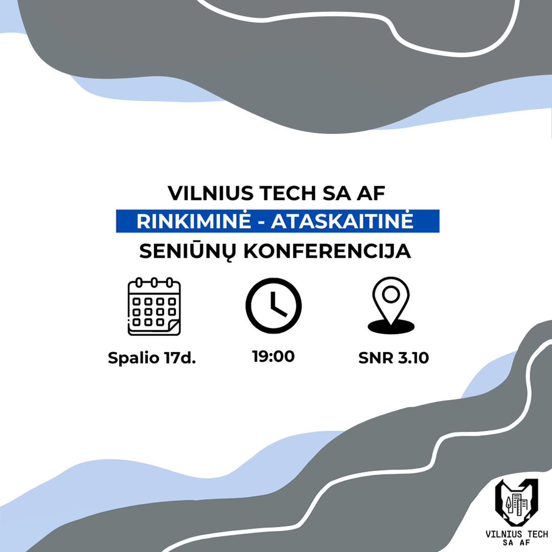 Kviečiame visus studentus spalio 17 d. atvykti į SNR 3.10 auditoriją 19:00 val į VILNIUS TECH SA AF ataskaitinę – rinkiminę seniūnų konferenciją, kurios metu savo kadenciją baigs VILNIUS TECH SA AF pirmininkė Agna Petkevičiūtė bei pristatys pusės metų veiklos bei finansines ataskaitas.