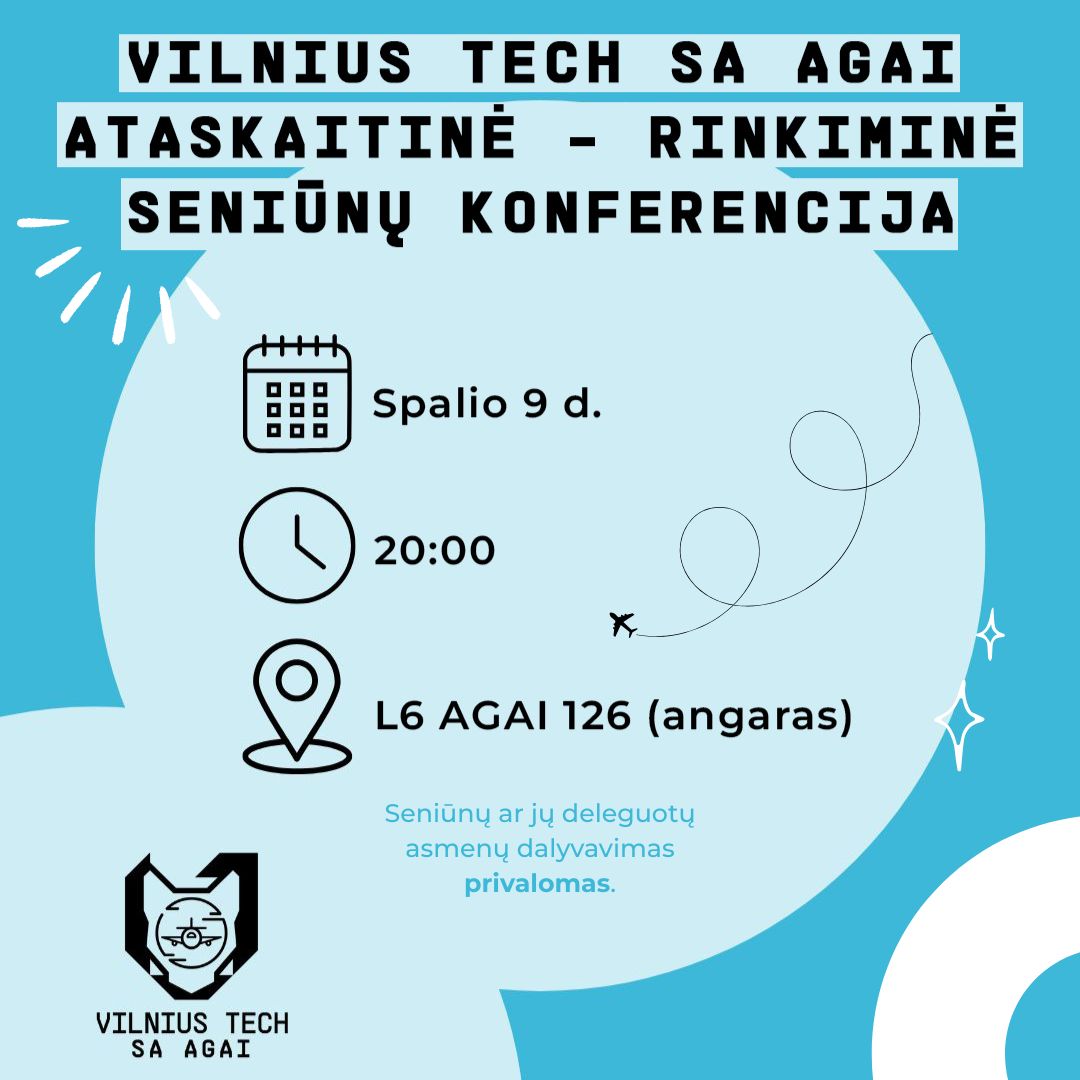 Kviečiame visus Vilniaus Gedimino technikos universiteto studentus į VILNIUS TECH SA AGAI ataskaitinę – rinkiminę seniūnų konferenciją, kuri vyks spalio 9-tą dieną (ketvirtadienį), 20:00 (registracija 19:30-19:50), L6 AGAI 126 (angare). Jos metu bus renkamas naujas VILNIUS TECH SA AGAI pirmininkas (-ė). 🩵✈️