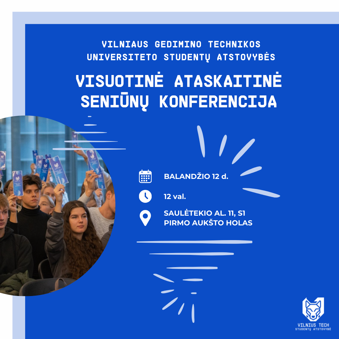 Kviečiame į Vilniaus Gedimino technikos universiteto studentų atstovybės eilinę visuotinę ataskaitinę seniūnų konferenciją, kurios metu prezidentas Ervin Borkovski pristatys praėjusio laikotarpio veiklos ir finansinę ataskaitas.