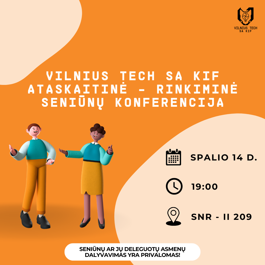We meet at the VILNIUS TECH SA KIF reporting and election seniors’ conference!October 14th, SNR – II 209 (Trakų g. 1, Assembly Hall),19:00. During the conference, the chairperson Dagnė Kvietkutė will present the annual activity and financial report, and a new VILNIUS TECH SA KIF chairperson will be elected. Please note that the participation of seniors or their delegated representatives is mandatory!