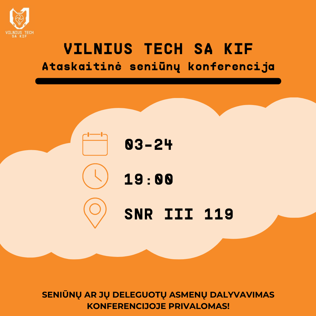 Kviečiame į VILNIUS TECH SA KIF ataskaitinę seniūnų konferenciją, kuri vyks kovo 24 d. Trakų g. 1 SNR lll – 119 auditorijoje. Seniūnų ar jų deleguotų asmenų dalyvavimas konferencijoje privalomas!