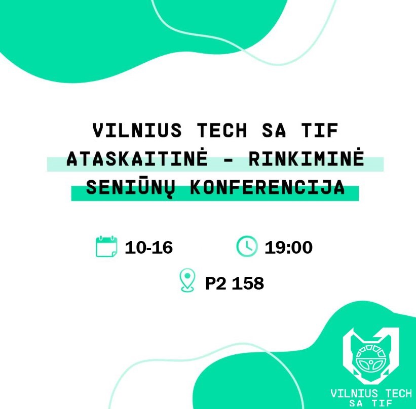 Kviečiame visus Vilniaus Gedimino technikos universiteto studentus į VILNIUS TECH SA TIF ataskaitinę – rinkiminę seniūnų konferenciją, kuri vyks spalio 16 dieną (trečiadienį)!