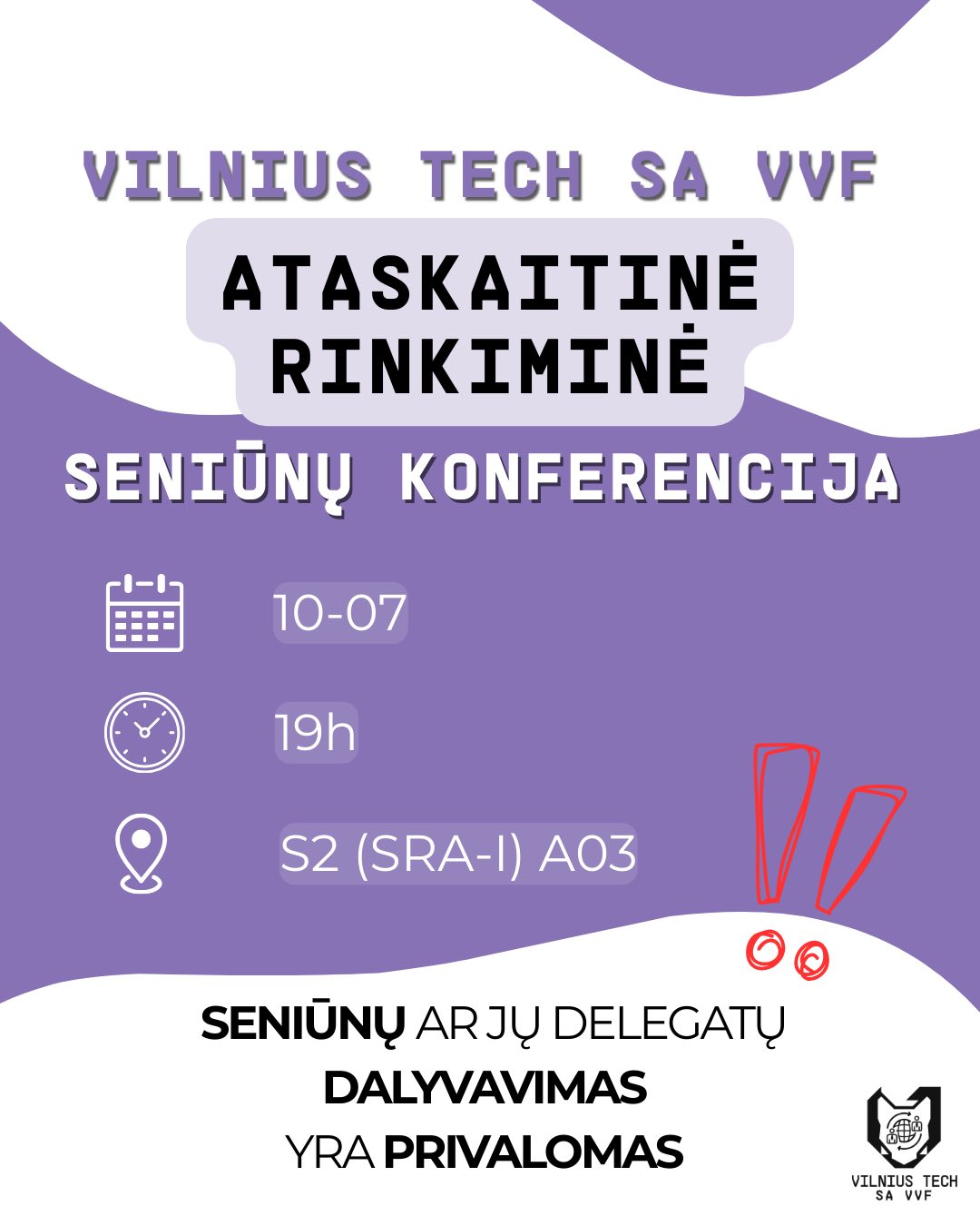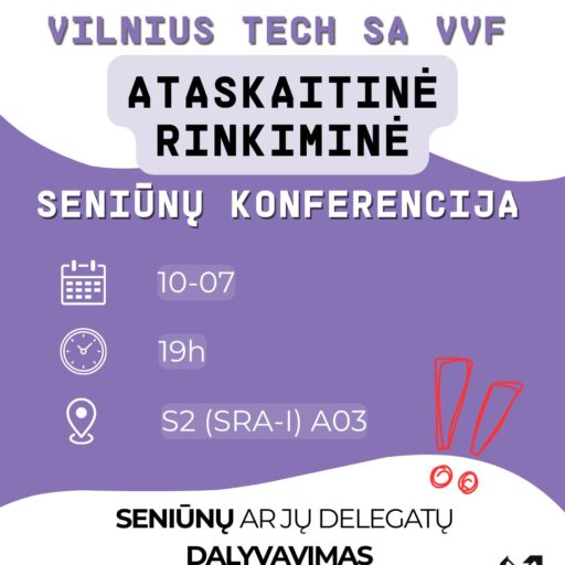 🇬🇧 On October 7th at 7:00 PM, we invite everyone to the VILNIUS TECH SA VVF reporting and election seniors’ conference, which will take place in S2 SRA-I A03. During the event, the VILNIUS TECH SA VVF chairperson, Goda Šarauskaitė, will present her activity report. A new VILNIUS TECH SA VVF chairperson will also be elected.
